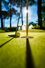 Image of Mini Golf yellow ball with a bat near the hole at sunset
