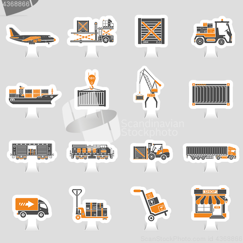 Cargo Transport, Packaging, shipping and logistics two color sticker Icon Set such as Truck, air cargo, Train, Shipping. Vector illustration\r