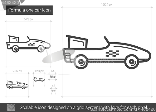 Formula one car vector line icon isolated on white background. Formula one car line icon for infographic, website or app. Scalable icon designed on a grid system.