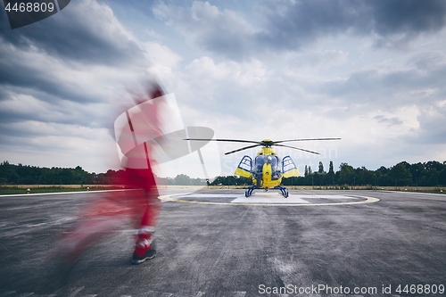 Alarm for helicopter emergency medical service. Paramedic running to helicopter on heliport.