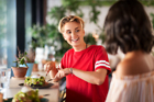 food and people concept - female friends eating at restaurant or cafe