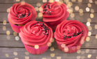 food, baking and pastry concept - close up of cupcakes or muffins with red buttercream frosting and sprinkles over festive lights