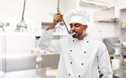 cooking, profession and people concept - happy male indian chef in toque tasting food from ladle over restaurant kitchen background