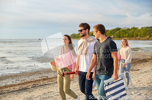 friendship, leisure and people concept - group of happy friends with guitar, picnic basket and folding chair walking along beach in summer