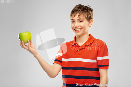 food, healthy eating and people concept - portrait of happy smiling boy in red polo t-shirt holding green apple over grey background