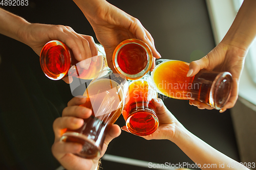 Image of Young group of friends drinking beer, having fun, laughting and celebrating together. Close up clinking beer glasses