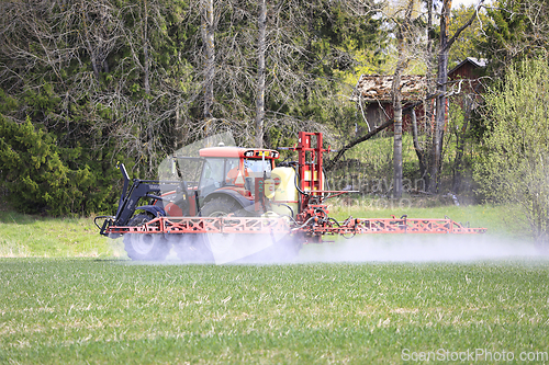 Farmer spraying field with Valtra tractor and Hardi Master Plus liftmounted sprayer on a day of spring. Salo, Finland. May 16, 2021.