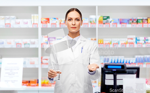 medicine, profession and healthcare concept - female doctor with pill and glass of water over pharmacy background