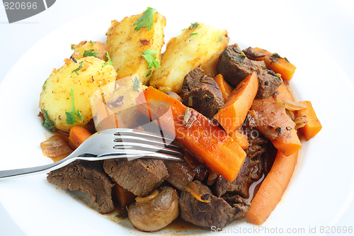 French-style beef and carrot stew with herbs, served with sauteed potatoes garnished with parsley